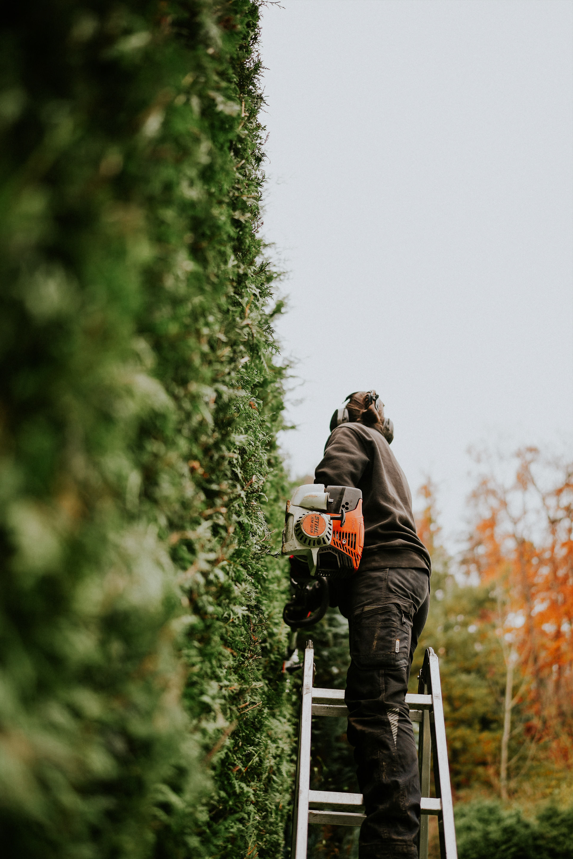 Nahaufnahme einer großen, dichten Gartenhecke mit einem Gärtner, der auf einer Leiter arbeitet.